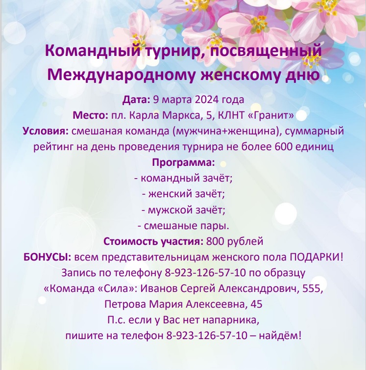 АНОНС. Командный турнир, посвященный Международному женскому дню