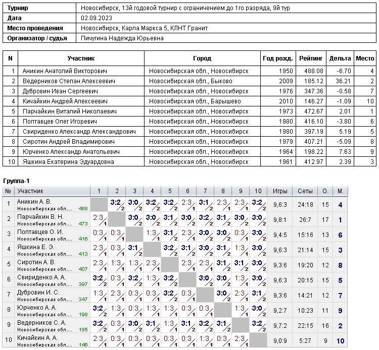 2.09.2023г., 13й Любительский турнир с ограничением до 1го разряда, 9й тур