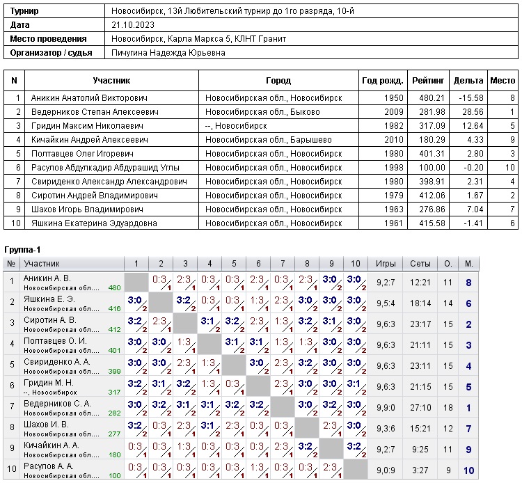 21.10.2023 г., 13й Любительский турнир с ограничением до 1го разряда, 10й тур