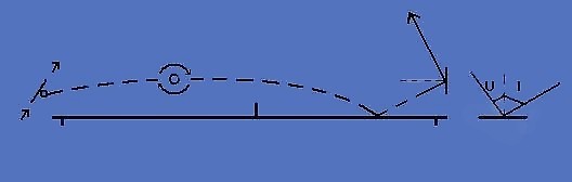 Удар с верхним вращением. Угол отскока мяча от стола меньше угла падения на стол.